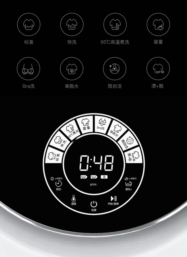 它支援八種洗滌模式,只要利用LED的觸控螢幕就可喚醒。特別的嬰童洗衣模式、Bra洗模式讓你可以對症下藥,不怕全拿去洗而把部分衣服洗壞了~