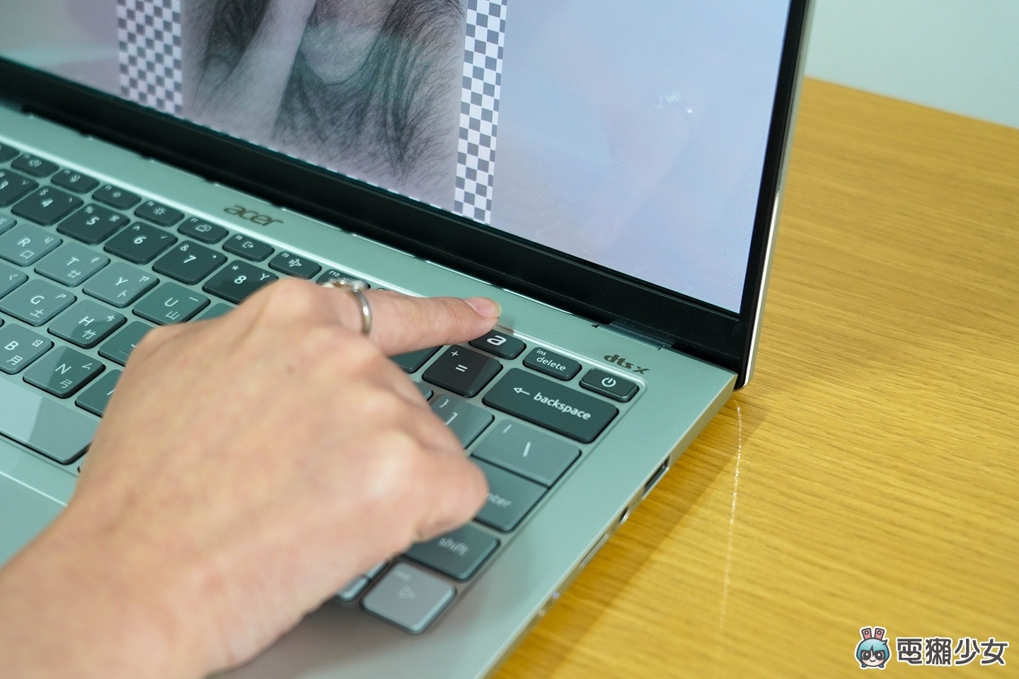 我對 Swift Go 14 的第一印象就是「輕」,整台重量只有 1.3kg,金屬鋁合金機身搭配銀色外觀,加上附贈筆電包帶出去非常輕鬆。A 面設計有幾何雷射雕刻,我手揣摩的這個閃電的圖案,就是代表「Swift」的開頭 S,有象徵 Speed(快速)、Sleek(流暢)與 Slim(輕薄)的意思,輕薄但功能沒有在少的,轉軸支援單手開蓋,一開到底最大 180 度平攤,開合滑順,一個小女子來開也是輕輕鬆鬆